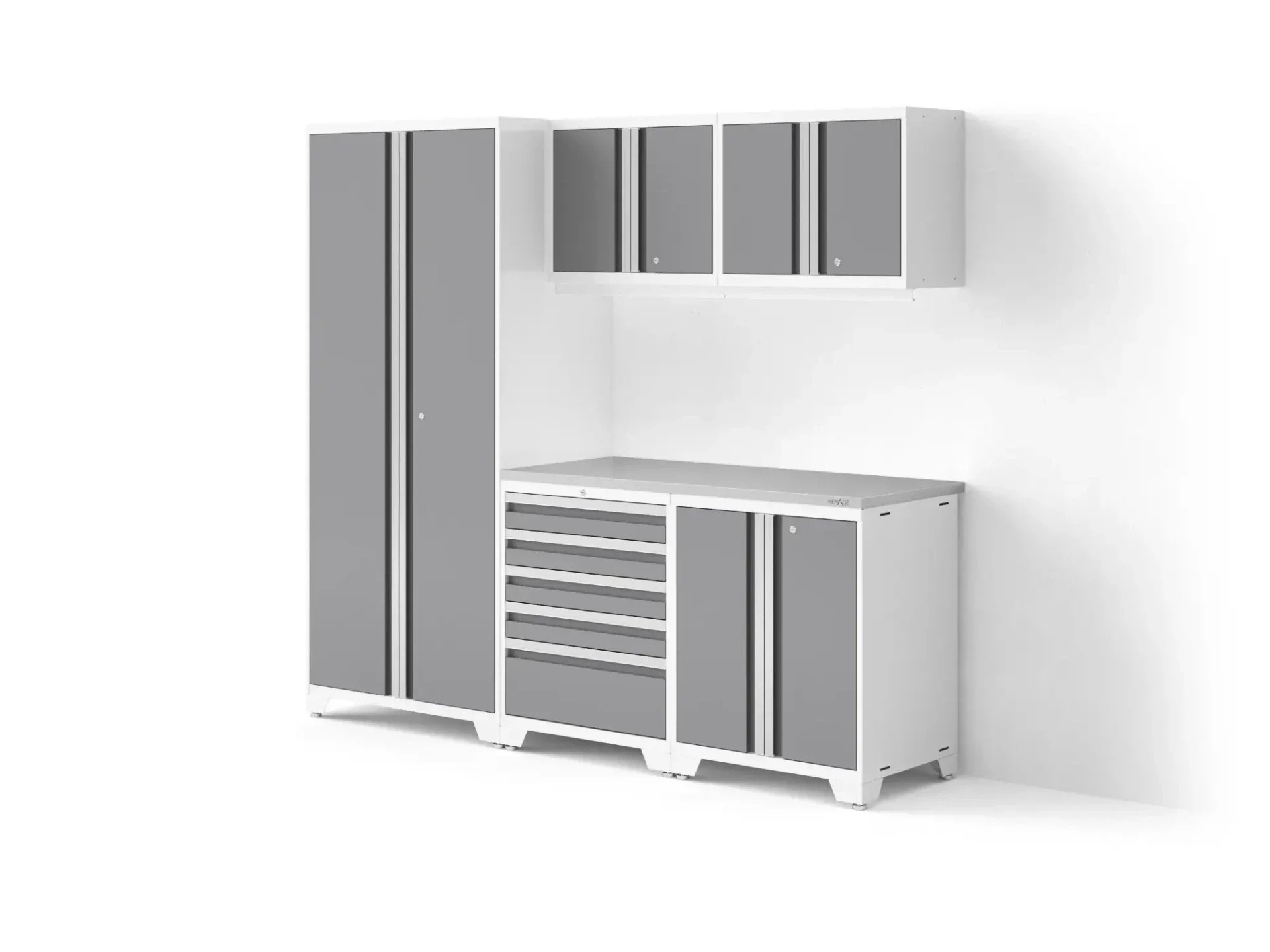 Optimisez votre garage avec la collection Pro Series de NewAge Products, des solutions de rangement robustes et modernes, conçues avec des fonctionnalités haut de gamme et un style digne d'un showroom. Nos armoires Pro Series sont fabriquées avec des cadres en acier renforcé, des portes à double paroi, des étagères en acier réglables et des pieds de nivellement, pour une configuration de rangement optimale qui s'adapte à votre espace et à vos besoins. Les poignées intégrées sur toute la longueur des portes verrouillables offrent un design épuré et compact, tandis que les charnières à fermeture amortie et les glissières à billes ultra-résistantes des tiroirs facilitent l'accès à vos outils et équipements. La collection Pro Series de NewAge Products est la solution idéale pour organiser votre garage.