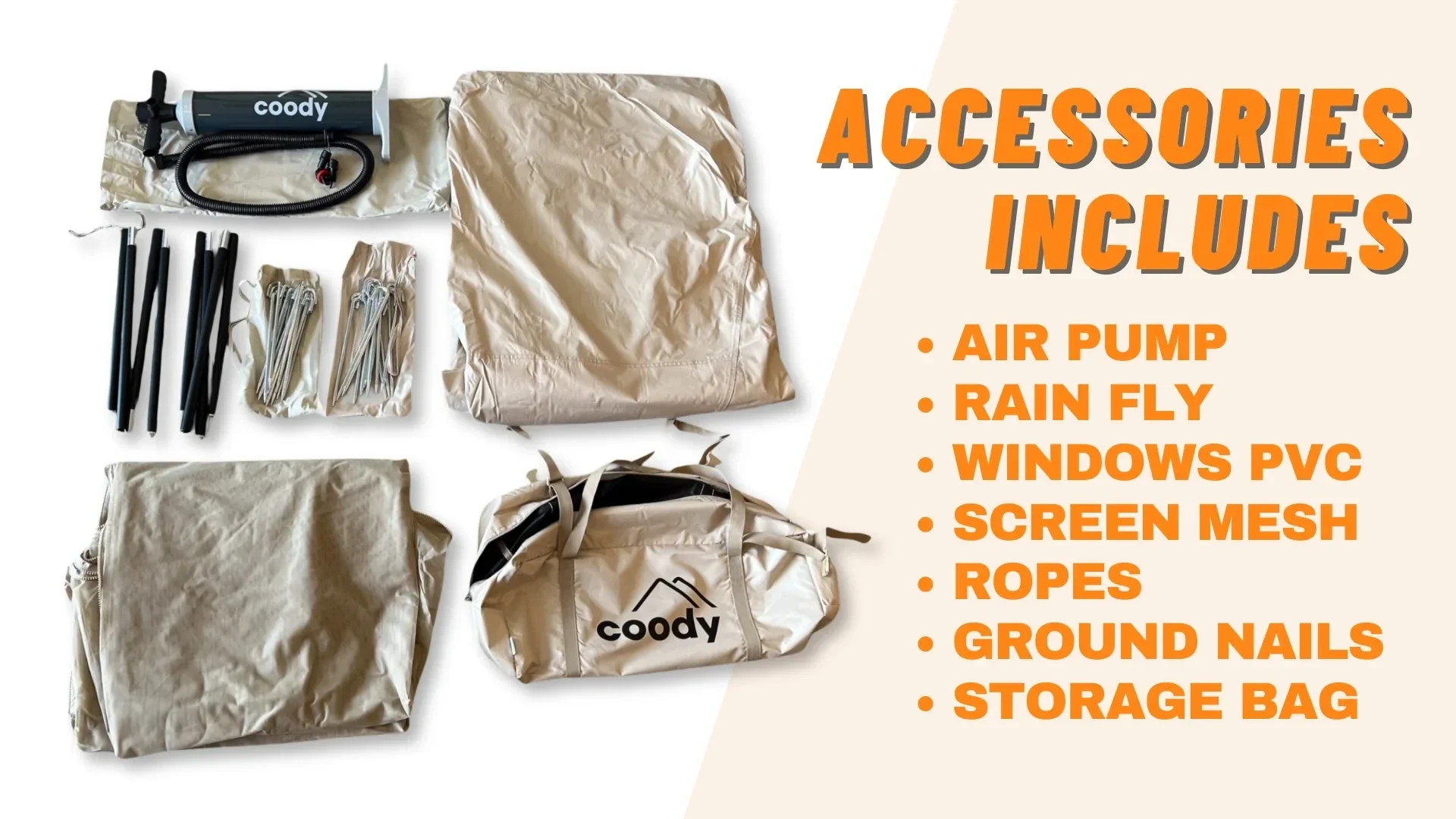 Accessoires inclus : pompe à air, double-toit, fenêtres en PVC, moustiquaire, piquets, sardines, sac de rangement