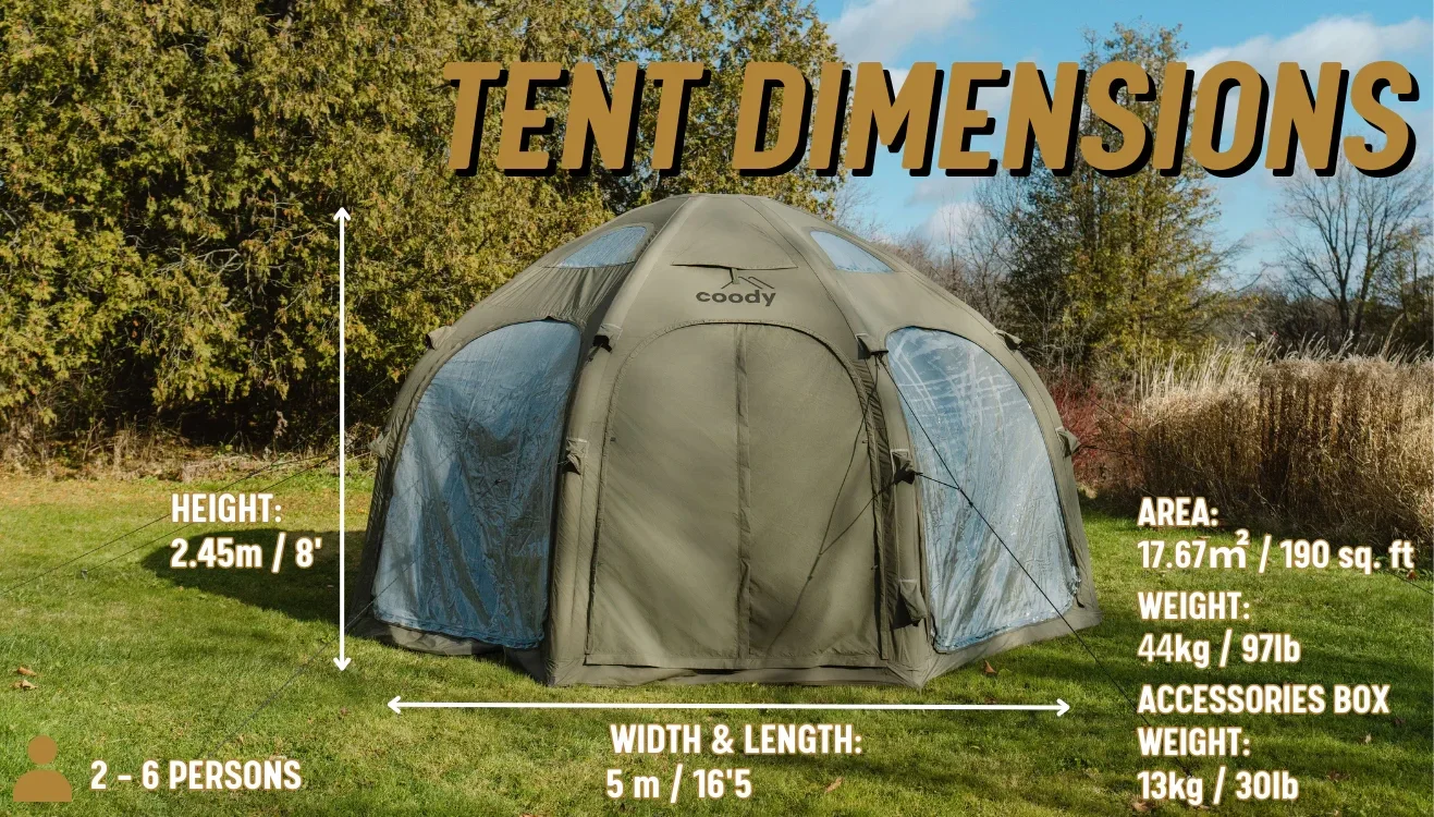 Recommandée pour 6 à 8 personnes, cette tente gonflable Coody Dome est idéale pour les séjours en camping en famille ou entre amis et convient à une variété d'activités. C'est la tente idéale pour le camping d'hiver et le glamping.